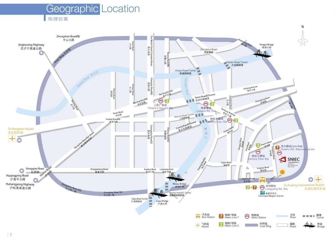 上海新国际博览中心(SNIEC)坐落于上海浦东经济与工业核心发展区,花木路,芳甸路,龙阳路交界处。地铁7号线可直达SNIEC,其花木路站紧邻上海新国际博览中心W5号展厅。此外, 大型交通枢纽中心—龙阳路站(位于龙阳路上) 距离SNIEC仅600余米,地铁2 号线、地铁7号线、磁浮列车、以及多条公交线路交汇于此,由龙阳路站步行10分钟,即可抵达SNIEC。